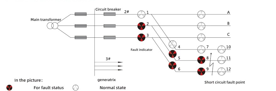 شارٹ سرکٹ کی خرابیوں کی خصوصیات کی بنیاد پر، عمل کا معیار حفاظتی آلہ کی بجلی کی خرابی کے ساتھ کرنٹ میں اچانک تبدیلی ہے۔ فالٹ انڈیکیشن ڈایاگرام کی تشریحی منطق اس طرح ہے: اگر فیز A کے اشارے 2، 5، اور 8 اور لائن 2 کے فیز C کے اشارے 3، 6، اور 9 سبھی سرخ ہوجاتے ہیں، جب کہ اشارے 11 اور 12 سفید رہتے ہیں، تو یہ طے کیا جاسکتا ہے کہ آؤٹ گو لائن پر شارٹ سرکٹ کی خرابی واقع ہوئی ہے۔